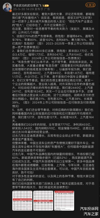 针对近期舆论场中“汽车圈恒大”的不实言论,比亚迪集团品牌及公关处总经理李云飞于5月30日通过公开回应,以详实的财务数据与行业对比,系统性澄清了相关质疑。