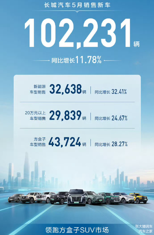 长城汽车公布了5月销量为10.22万辆,同比增长11.78%。其中新能源车型销量为32638辆,同比增长32.41%。在方盒子SUV这个细分领域还是很有话语权的,销量达43724辆,同比增长28.27%。