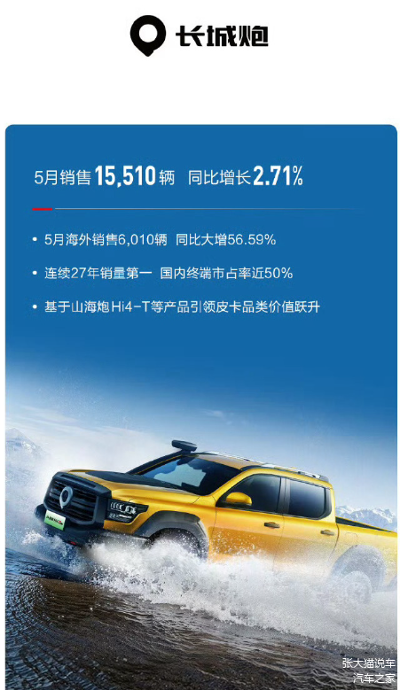 长城炮5月销量15510辆,同比增长2.71%。5月海外销售6010辆,同比增长56.59%。连续27年销量第一,国内终端市占率近50%。