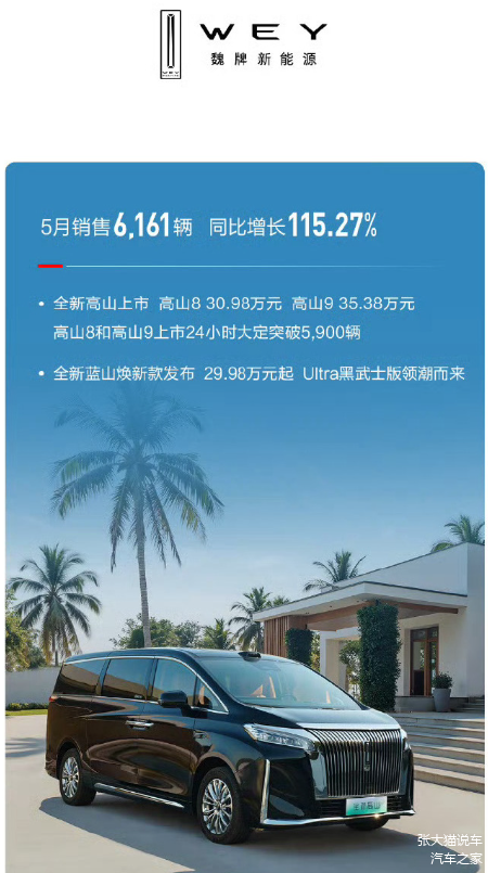WEY品牌5月销量6161辆,同比增长115.27%。该系列主要靠蓝山扛大旗,近两个月销量3000+。5月全新蓝山上市,起售价30.98万元,24小时大定5900+辆,市场表现很是不错。