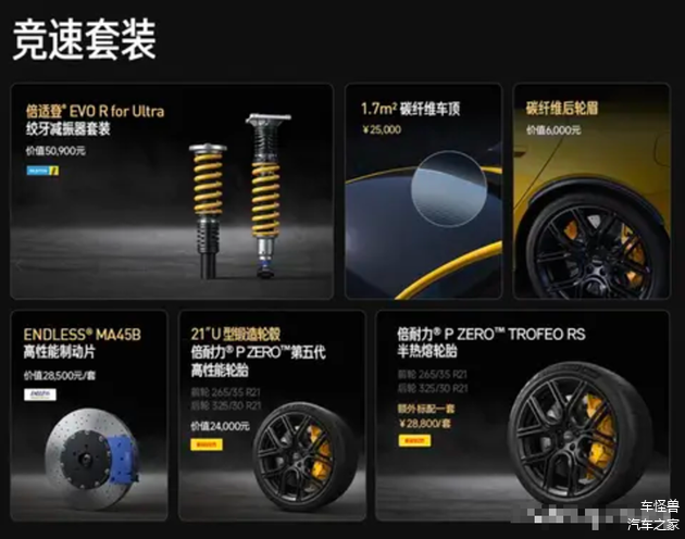 小米SU7 Ultra赛道专业套装版所配备的所有改装配件,都是小米SU7 Ultra原厂专门定制的。这些配件包括倍适登EVO R for Ultra绞牙减振器、倍耐力P ZERO TROFEO RS半热熔轮胎、ENDLESS高性能制动片和21英寸U型锻造轮毂等,这些配件能够在一定程度上提高车辆的操控性能。之前,小米SU7 Ultra在国内的各大赛道挑战以及在德国纽北赛道的比赛中都装备了“赛道专业套装”。