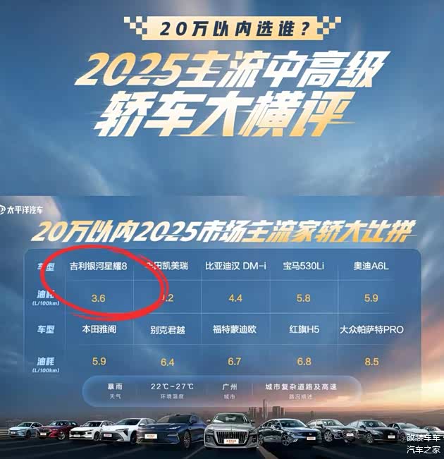 在2025年广州暴雨天的B级车横评实测中,吉利 银河星耀8以3.6L/100km的综合油耗数据封神。这场涵盖9款20万内主流家轿的实测,在城市暴雨路况与高速场景中,星耀8的油耗表现比第二名低出近20%,直接刷新混动车型的价值坐标系。