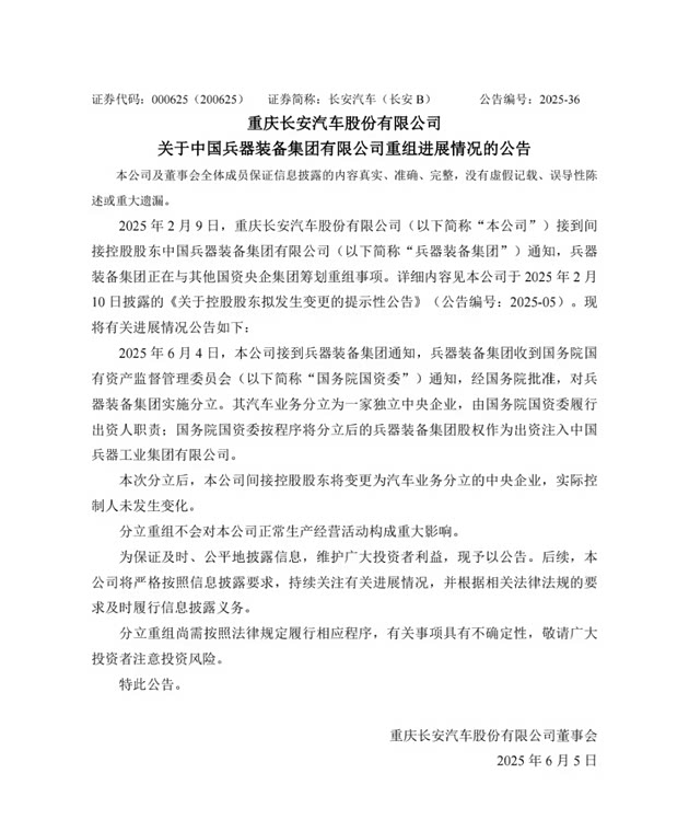 6月5日,重庆长安汽车股份有限公司发布《关于中国兵器装备集团有限公司重组进展情况的公告》称,“2025年6月4日,本公司接到兵器装备集团通知,兵器装备集团收到国务院国有资产监督管理委员会(以下简称“国务院国资委”)通知,经国务院批准,对兵器装备集团实施分立。其汽车业务分立为一家独立中央企业,由国务院国资委履行出资人职责;国务院国资委按程序将分立后的兵器装备集团股权作为出资注入中国兵器工业集团有限公司。”