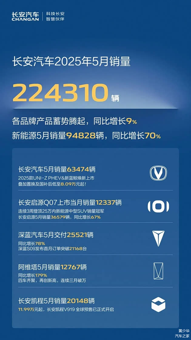 就在几天前,长安汽车发布的5月销量数据显示,在行业价格战白热化的阶段,长安却逆势上涨:总销量达22.43万辆,同比增长8.47%,其核心动能来自新能源板块——单月销量达9.48万辆,同比暴涨69.88%,占整体销量比例突破42%。