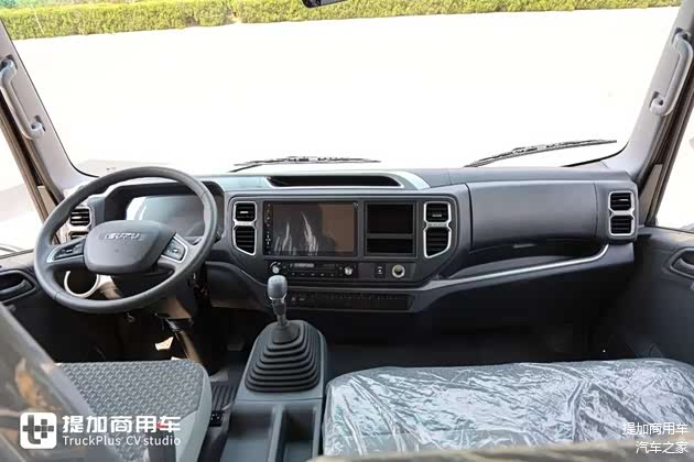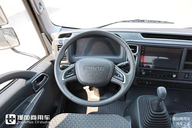 在轻卡方向盘造型中,五十铃绝对是既好看又实用的那一款,二幅式多功能方向盘拥有超大的仪表观察视野,上方的多功能按键集成定速巡航、车机控制、仪表控制等功能。
