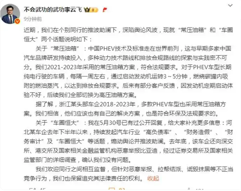 当然,面对如此激烈的言论,比亚迪方也做出了回应,比亚迪集团品牌及公关处总经理李云飞回应表示“关于常压油箱,中国PHEV技术及标准走在世界前列,这与早期多家中国汽车品牌研发持续投入,多种动力技术路线和排放合规路线的探索与实践密不可分。我们2021-2023年采用的常压油箱方案,符合法规要求。对于PHEV车型长期纯电行驶的车辆,每隔一周左右,通过启动发动机运转3~5分钟,燃烧碳罐内吸附的燃油蒸汽,以达到排放合规要求。后来有部分客户反馈,因发动机定期启动体验不好,后续我们全部切换为高压油箱方案。”同时,他还称“据了解浙江某头部车企2018-2023年,多款PHEV车型也采用常压油箱方案。我们相信,他们应该也有自己的解决方案,也是符合环保及法规要求的。”