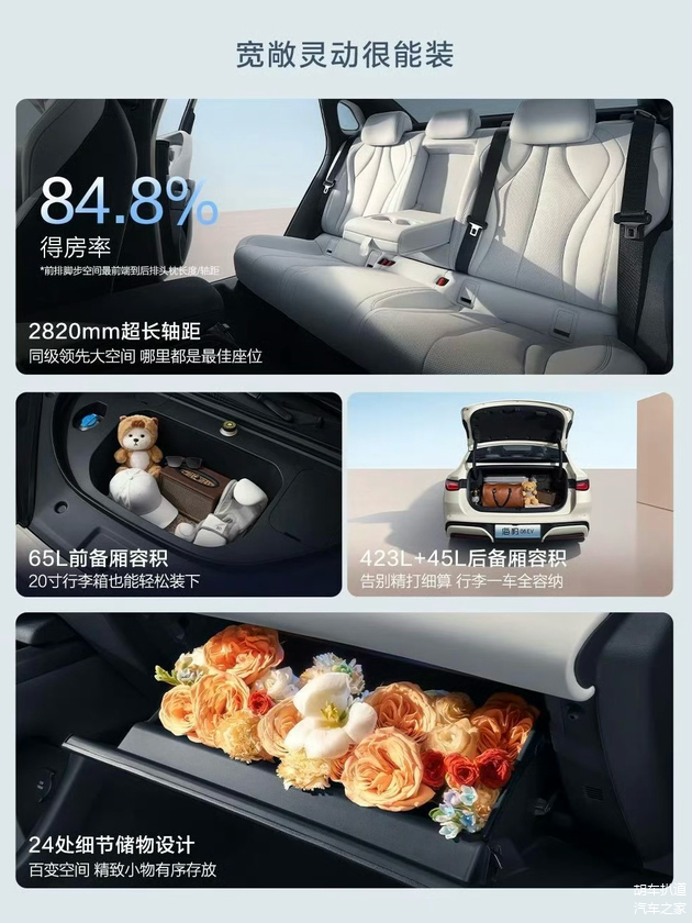车身尺寸4720×1880×1495mm,轴距2820mm,得房率高达84.8%。另外配备65L前备箱,可容纳20寸行李箱,后备箱标准容积达到423L(含45L隐藏空间)及24处储物设计,兼顾大件装载与随身物品收纳。