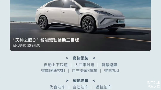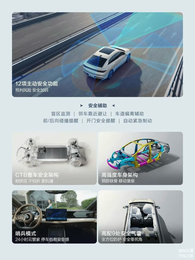 对电动车来说,安全至关重要。海豹06 EV在这方面可是下了大功夫。首先在智能驾驶辅助上,海豹06 EV全系标配比亚迪自研的“天神之眼 C”智能驾驶辅助系统(三目版)。它利用5个毫米波雷达、12个超声波雷达等传感器和强大算法,支持高速/快速路领航、自动泊车、AEB自动紧急刹车等20多项实用功能。