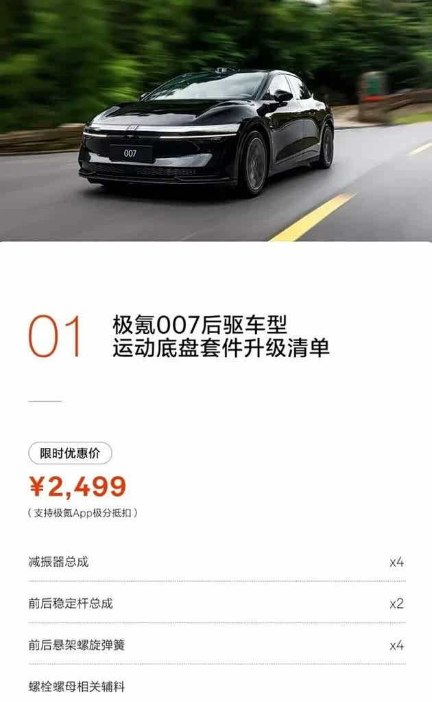 这是极氪官方针对007后驱版车型推出的运动风格底盘套件。顾名思义,便是通过避震&前后防倾杆的更换,以达到一个更运动风格底盘的驾驶感受。当然,最让大家觉得惊喜的还是价格:2499元。这个价格可以说是颠覆了“改装佬”的认知。