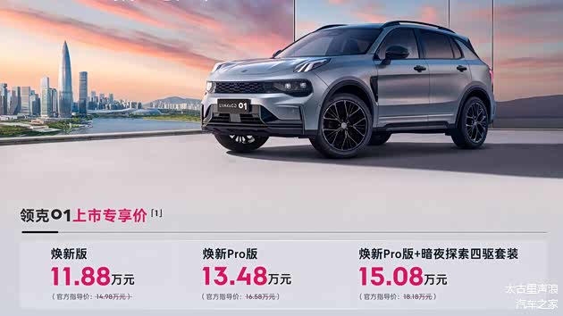 近日, 领克01焕新版和焕新Pro版上市,售价分别为11.88万和13.48万元。同时,焕新Pro版可选装“暗夜探索四驱套装”,售价为15.08万元。