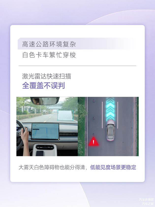 知名车评人毒舌小酸奶也说过:“相比于纯视觉方案,在雨雾,夜间等能见度很低的天气里。激光雷达感知能力更强,能穿透雨雾和暗区,及时识别前方路况。所以说,激光雷达能极大提升你的安全下限。”