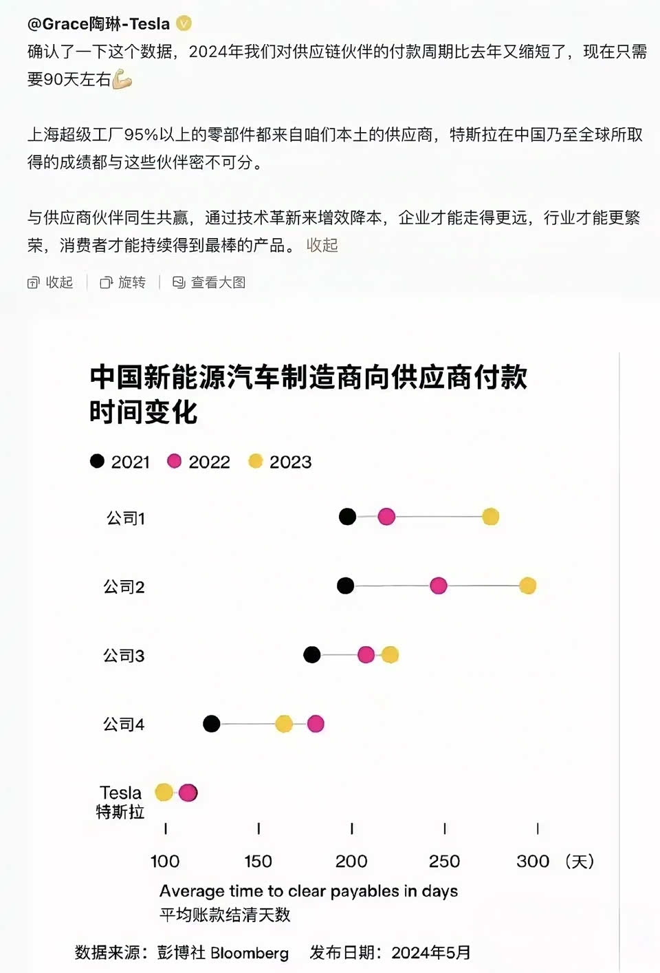 在去年11月28日,特斯拉副总裁陶琳对外发文称“特斯拉付款周期已经压缩至90天”,为此,还引发了行业热议。