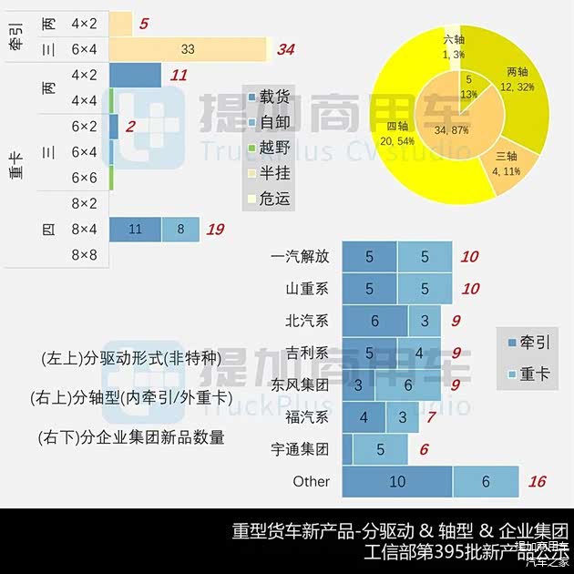 对本批76款重型货车新品进行驱动形式和轴型的细分,主要变化有:1、三轴牵引34款持续领先,但与四轴重卡19款的差距被缩小,且两轴重卡11款迎头追赶,二者合计数量已与头名规模相仿;2、自卸类九款保持季节性强势,并有一款小三轴柴油新品,整体伴随施工旺季走高;3、本月期的两款越野类新品均为东风系,也是企业着力发展的“特色”产品,下文简述。