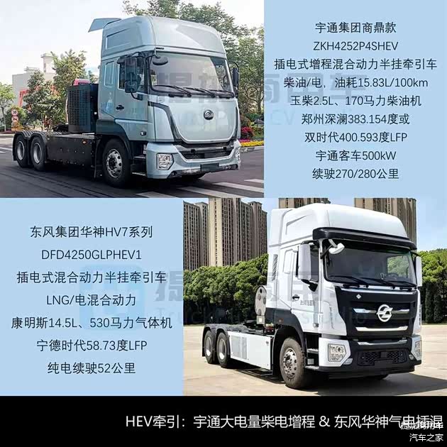 - 宇通集团本批申报了大电量款的ZKH4252P4SHEV插电式增程混合动力半挂牵引车,采用商鼎款驾驶室、准乘2人,柴电增程混动方案,轴距3.9米,可选12组板簧悬挂,准拖38.87/38.57/38.17吨挂车,匹配玉柴2.5L、170马力柴油机,搭载郑州深澜383.154度或双时代400.593度LFP动力电池、轴间两侧底置+驾驶室半背置方案,宇通客车500kW驱动系统,油耗15.83L/100km,纯电续驶270/280公里,在同类车型中是绝对意义的最大电量车型。对增程类牵引车而言,行业目前共有18款可售车型,包括十款醇电增程、气电增程六款(CNG两款+LNG四款)以及柴电增程两款,其中还有两款采用换电式技术路线,吉利华菱的远程星瀚G系HN4250X44C9SHEVY插电式增程混合动力换电式牵引汽车曾以宁德时代344.24度LFP动力电池+纯电续驶320公里一度领先。而宇通集团本批新品的出现也刷新了同类车型搭载电量的新高,从而与绝大多数的60-140度级别形成有效区隔,应被视为是对增程技术路线的一次有趣探索。