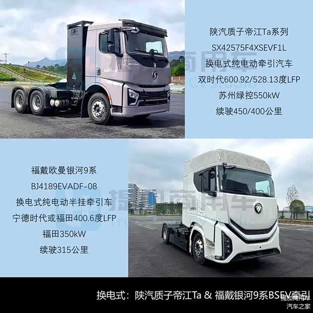 - 首先是陕汽德创质子汽车的帝江Ta系列SX42575F4XSEVF1L换电式纯电动牵引汽车,是其第二款BSEV车型,迎合行业特点搭载了电量加大的双时代600.92/528.13度LFP动力电池、驾驶室后背置方案,苏州绿控550kW驱动系统,续驶450/400公里。该系首款换电车型为去年5月期的SX42575F4XSEVF1,搭载宁德时代400.619度LFP动力电池+西安智德410kW驱动系统,续驶260公里——对比可知行业的确在不断追求技术进步与提升。