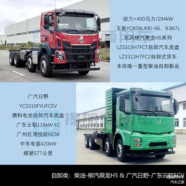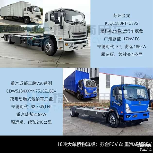 宇通大电量柴电增程、东风气电混动,18吨载货:苏金FCV、重汽成都BEV大中卡