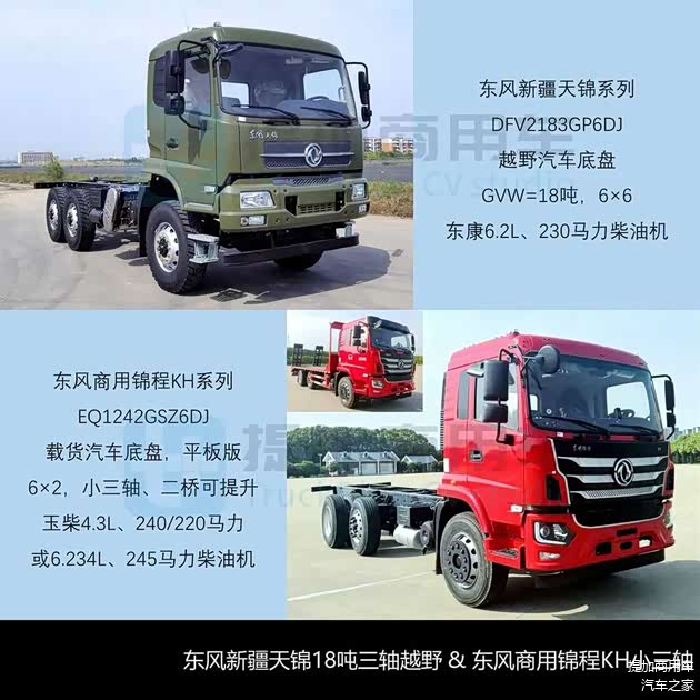 - 本月期2字头越野类新品均由东风系企业申报,包括4×4东风商用天锦VR系列DFH2180B,以及三轴6×6东风新疆天锦系列DFV2183GP6DJ两款越野汽车底盘。后者作为典型18吨三轴越野款,继承了东风沙豹系列的沙漠工况经验积累,基础车宽2.4米、准乘2/3人也是典型“大中卡”规格,轴距3.5米,前10片、后12片板簧悬挂,315号轮胎,搭载东风康明斯6.2L、230马力柴油机,似有后拖车钩,公告注明仅改装作业类车辆。