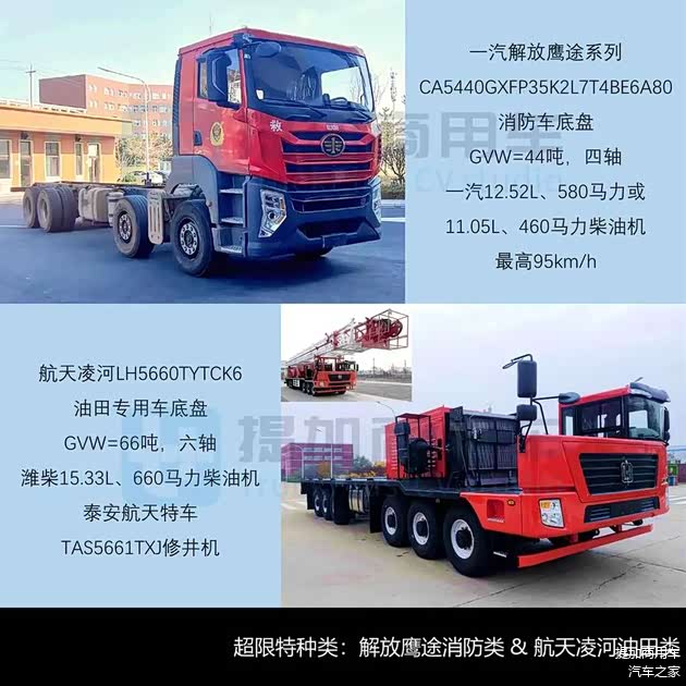 东风系越野款、锦程KH平板小三轴,解放鹰途44吨消防类、航天系整合油田类