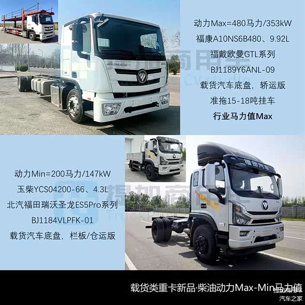 载货类柴油动力Max=480马力/353kW,即福田康明斯9.92L的A10NS6B480柴油机,由福田戴姆勒BJ1189Y6ANL-09载货汽车底盘,以及轿运版整车采用,欧曼GTL系列驾驶室、准乘2人,采用平顶规格、基础高度仅有2720mm,轴距7050mm,前2/3片板簧、后空气悬挂,准拖15-18吨共计13组规格挂车,可选福康8.5L、400马力方案,形成整车后全长12米、额载6.07吨,油耗26.5L/100km。截止第393批红头文件,在行业共计78款18吨车辆运输车中,本批新品也是柴油动力马力值的Max者,此前记录同由福戴欧曼GTL系列的BJ5189TCLY6ANL-02车辆运输车所把持,最大匹配8.5L、400马力柴油机,本次则“再进一步”。