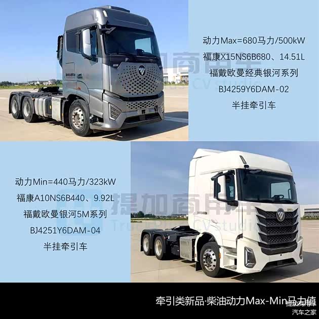 牵引类柴油动力Max=680马力/500kW,即福田康明斯14.51L的X15NS6B680柴油机,整体规格与上月期的潍柴WP15H680E68S基本一致,由福田戴姆勒BJ4259Y6DAM-02半挂牵引车采用,欧曼经典银河驾驶室、准乘2/3人,可选欧曼经典或升级款(星辉/星翼版)以及焕新后的银河家族造型,轴距3.3/3.45米,可选九组板簧或前1/2/3片板簧、后空气悬挂,准拖39.1-40吨的六组挂车规格,同时可选福康其他11组动力方案,覆盖11.82/12.89/14.51L的480-660马力区间,油耗35.3/35.5/34.8L/100km,其中覆盖“大马力区间”的有600/620/660马力三组方案——可知福戴正在细化柴油动力配置。