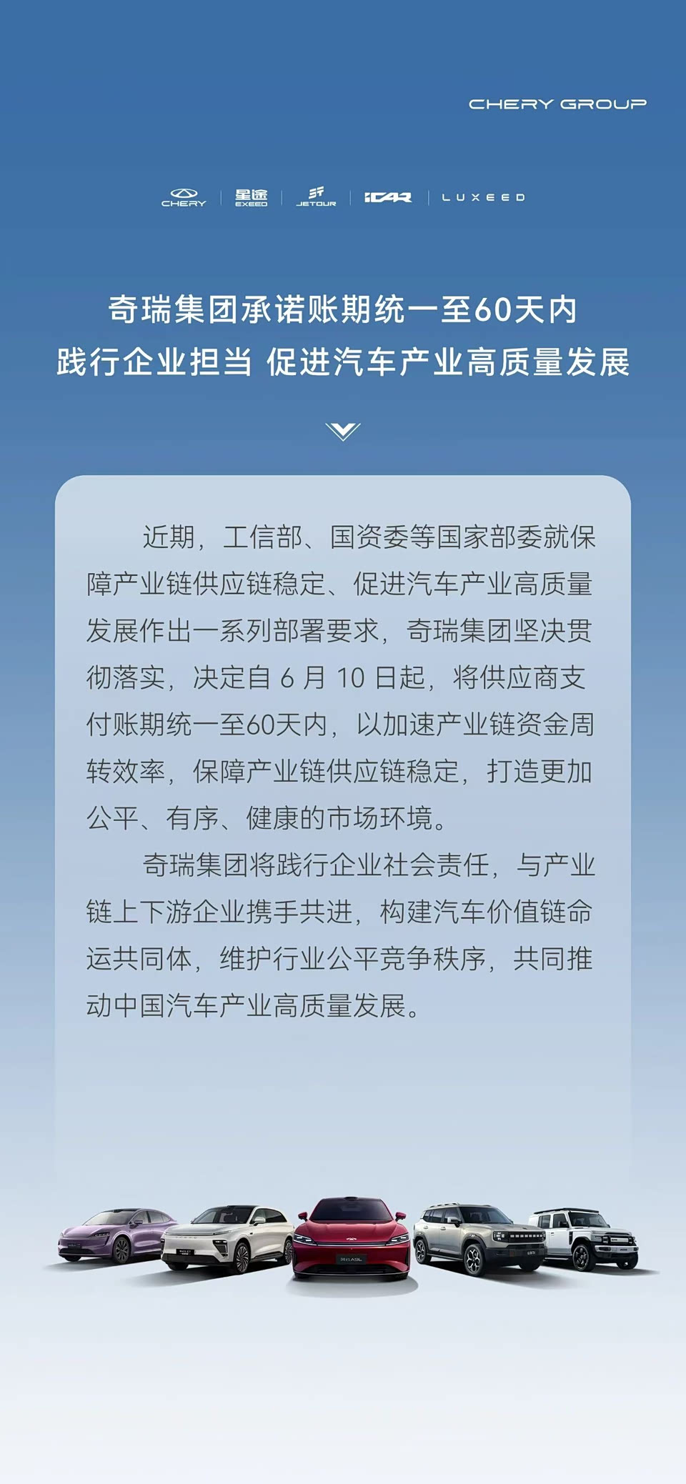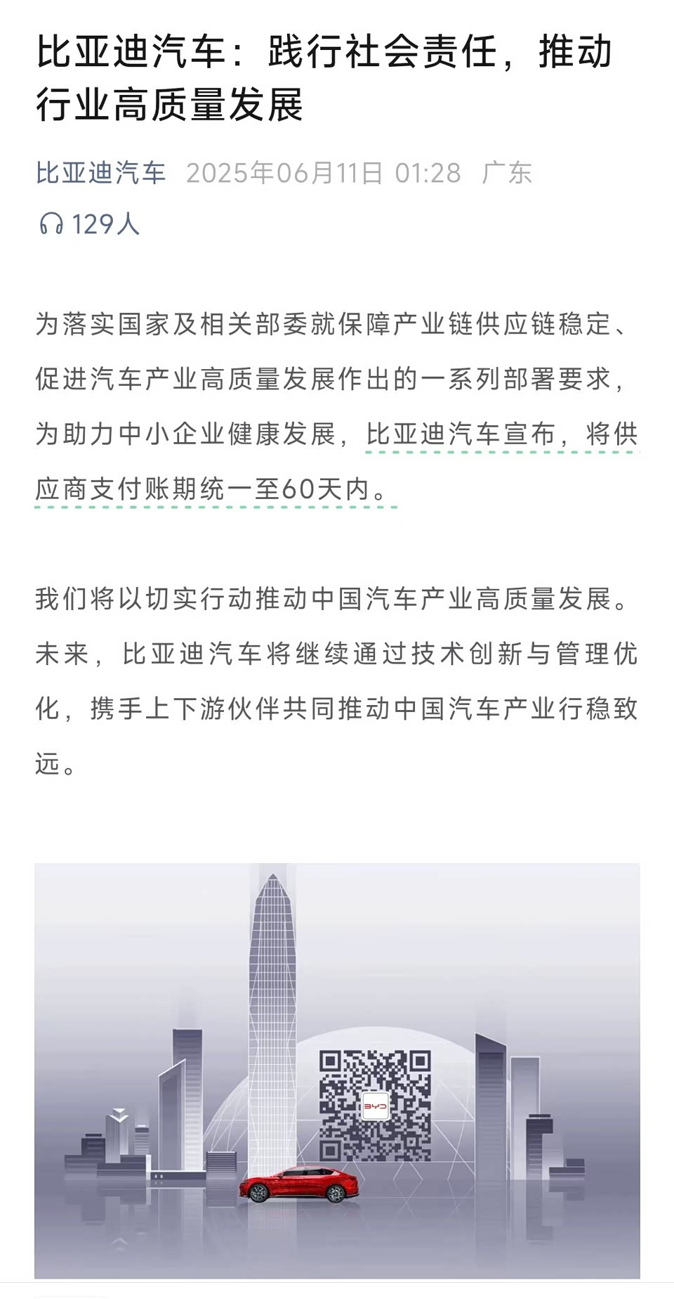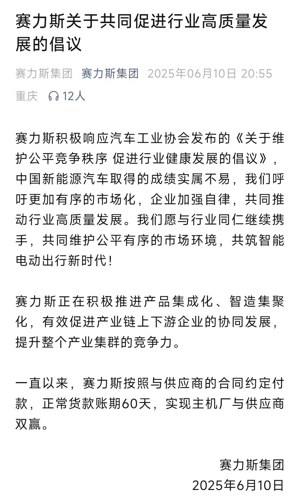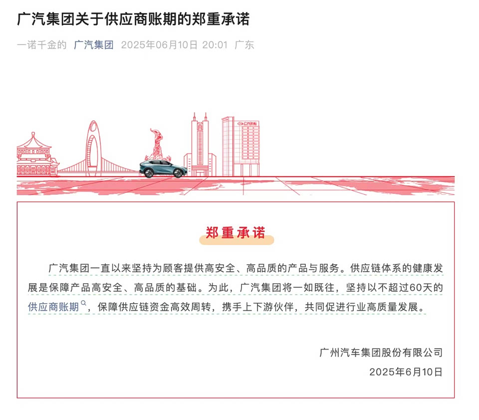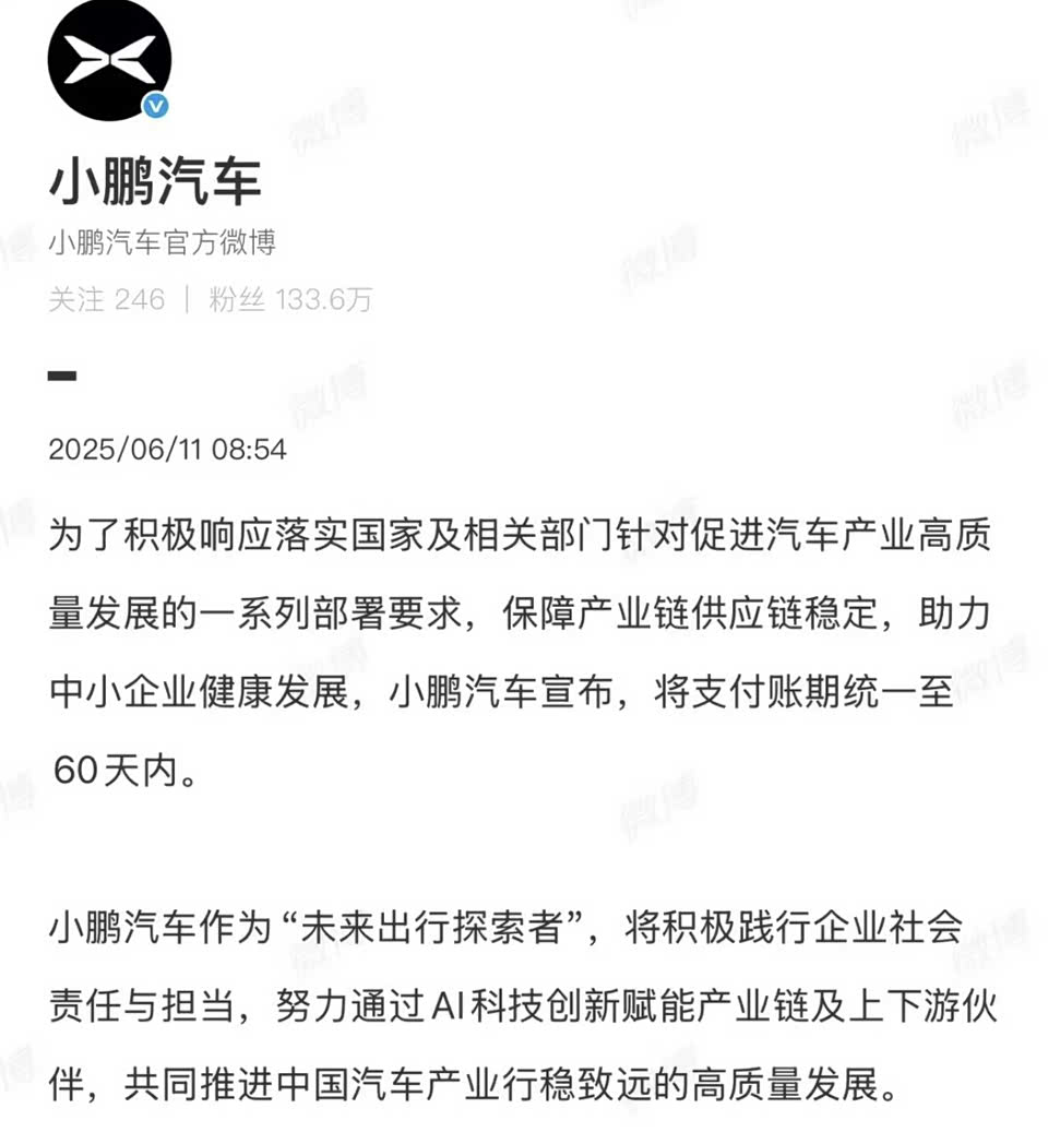 比亚迪凌晨一点多还发文,要将账期统一至60天内;6月11日长城、小鹏、理想和零跑都发声跟进。
