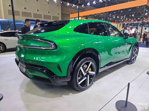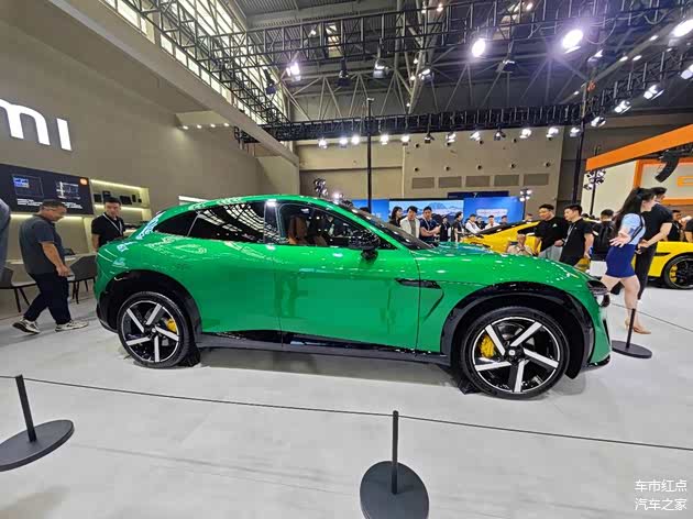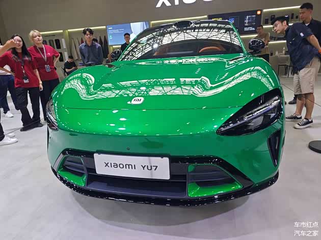 这也是小编第一次看到宝石绿配色的实车,在展台的聚光灯下,的确显得艳丽而明亮。另外,小米YU7的车身尺寸达到4999mm/1996mm/1600mm,轴距为3000mm,作为一台中大型SUV,实车在视觉上并不显大,不过运动感还是很足。