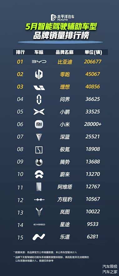 从车型品牌维度深入剖析,王朝系列和海洋网系列作为比亚迪的销售主力军,在 5 月表现依旧亮眼,智驾车型销量达 206,677 辆,展现出强大的市场号召力。方程豹品牌尽管定位独特,但其 5 月 10,567 辆的销量成绩,显示出硬派越野与智能驾驶融合后产生的独特魅力,市场潜力不容小觑。腾势品牌凭借其高端家用定位,售出 13,688 辆智驾车,彰显了其在中高端市场的稳固地位。仰望品牌虽销量相对较少,仅为 127 辆,但其作为比亚迪冲击高端智能驾驶市场的先锋,以顶尖技术树立了品牌高度,为后续发展奠定了良好基础。