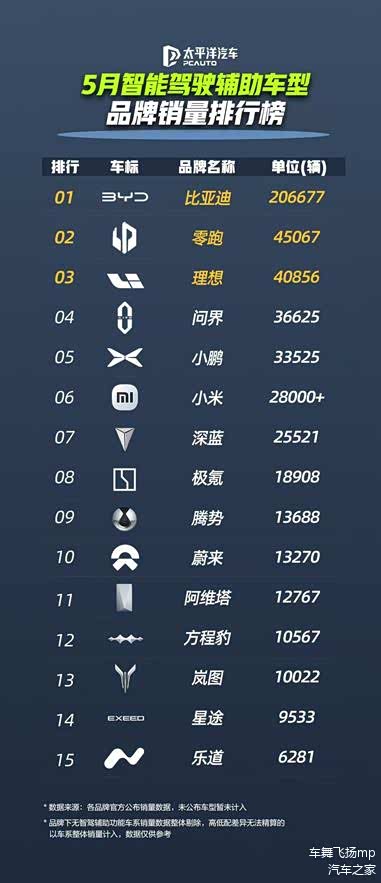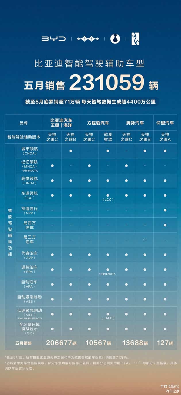 从车型品牌维度深入剖析,王朝系列和海洋网系列作为比亚迪的销售主力军,在 5 月表现依旧亮眼,智驾车型销量达 206,677 辆,展现出强大的市场号召力。方程豹品牌尽管定位独特,但其 5 月 10,567 辆的销量成绩,显示出硬派越野与智能驾驶融合后产生的独特魅力,市场潜力不容小觑。腾势品牌凭借其高端家用定位,售出 13,688 辆智驾车,彰显了其在中高端市场的稳固地位。仰望品牌虽销量相对较少,仅为 127 辆,但其作为比亚迪冲击高端智能驾驶市场的先锋,以顶尖技术树立了品牌高度,为后续发展奠定了良好基础。