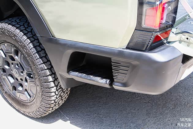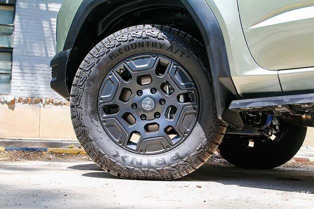 实拍车型配备的是来自浦林的AT胎,规格为265/65 R18。铁灰色的轮辋搭配粗壮的辐条进一步提升整车的肌肉感。