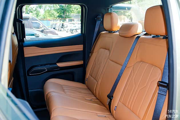 座椅运用了软性皮质材料包裹,并且还采用符合人机工程学的分块布局,强化了坐垫舒适度、靠背及侧翼支撑感。后排座椅靠背角度达到舒适的26度,坐垫长度提升至近500mm,为后排乘客提供了超越同级皮卡的腿部支撑和长途乘坐舒适性。