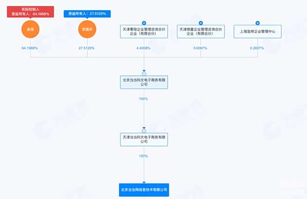 天眼查显示,目前当当网的实际控制人是俞渝持股比例64.2%,李国庆持股27.51%。