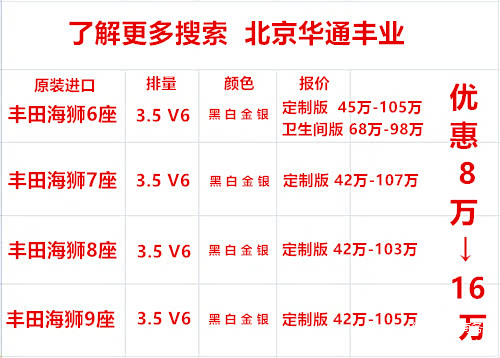 丰田海狮4s店丰田海狮售价区间为37.88-105.88万,华通丰业丰田海狮正规手续全国上牌! 华通丰业丰田海狮外观颜色:玛瑙红 石英白 至臻黑 钛银双拼色外观 金色 银色 上金下紫 白色 黑色。华通丰业丰田海狮(6座/7座/8座/9座10座/11座/12座/13座)丰田海狮6座7座8座9座10座13座现车。