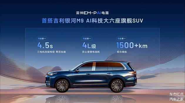 相比于雷神EM-i AI电混,雷神EM-P AI电混更强调性能。在雷神EM-P AI电混的搭载下,匹配了独立三电机四驱构型的吉利银河M9作为一款中大型大六座SUV,零百加速仅4.5秒,百公里馈电油耗4L级,综合续航超过1500km。