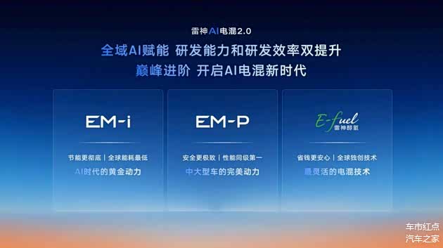 在星睿AI云动力2.0的赋能下,雷神EM-i AI电混、雷神EM-P AI电混以及雷神醇氢EF,也将以差异化的技术路线组合,覆盖不同消费群体的使用需求。其中雷神EM-i AI电混主打经济节能,其所搭载的电混发动机热效率高达47.26%,P3电机功率可达到175kW,百公里馈电低至2L级。