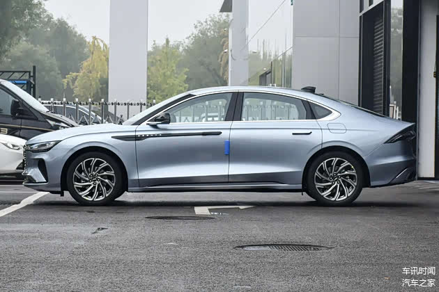 此外,车身侧面的设计更是独具特色,流畅的溜背线条结合隐藏门把手风格,显得与新能源车型如出一辙。轮胎规格倒是比较普遍,中低配对应不同的轮毂尺寸,分别为19英寸和18英寸,不过轮毂样式相对有些普通,没有太大的视觉冲击力。车尾的设计延续了家族特性,贯穿式尾灯组风格鲜明,下方的排气管隐藏于内且环绕银色镀铬饰条,使得层次感分明,而且看起来也更优雅大气。