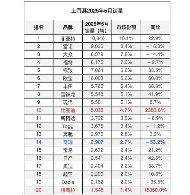 5月份,大部分中国品牌在土耳其的排名相对于4月份都出现了下跌。比亚迪虽然比4月份下跌1级,但是依然在前10榜单,排名第10。销量达到5,036辆。奇瑞暴跌超过五成,同比跌幅去到53.2%,销量2907辆。不过排名上升1级,站在第14的位置。