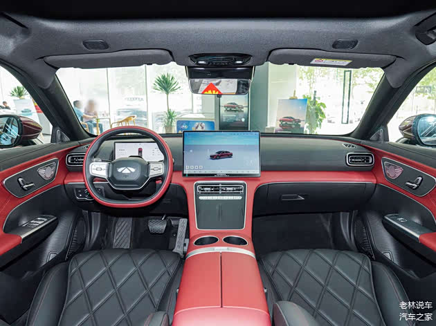 来到车内,你会发现它的内饰设计十分简洁,配备了液晶仪表盘和15.6英寸中控屏幕,前排地台上没有换挡机构,而是采用了电子怀挡。该车的方向盘采用了两辐式设计,外红内黑,十分个性。
