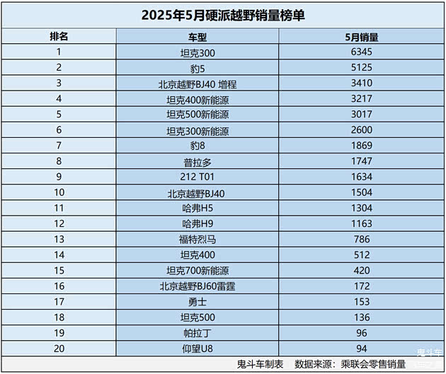 这一细分市场虽然看着热闹,事实上,销量表现并没有想象中那么高。销量数据是最好的证明,日前,乘联会发布5月销量数据,鬼哥整理出硬派越野车销量排名前二十的榜单。