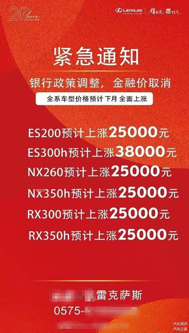 近日,网上传出一张疑似雷克萨斯某经销商涨价的“紧急通知”海报,引起了不小动静。海报显示,因银行政策调整,金融价取消,全系车型预计车型下月起全面涨价。