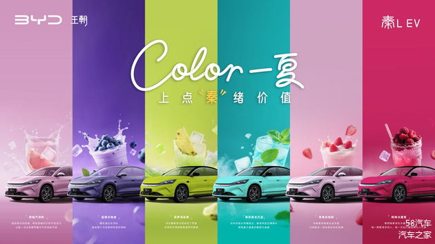 灵感来自夏日饮品,比亚迪秦 L EV 推出的多巴胺色车膜包含西柚气泡粉、蓝莓灰魅紫、菠萝海盐黄、薄荷莫吉托蓝、草莓优格粉,以及杨梅冰露紫等6种颜色,与现场身着改色车膜同色时装的模特同台,视觉冲击一波又一波。