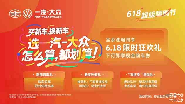 眼下,一年一度的618购物狂欢节即将来临,可能很多人只知道,对于手机、电脑、家电或是很多生活用品,可以享受到大幅优惠,但殊不知,如今的汽车也早已加入到狂欢的行列。所以,打算买车的网友,请不要错过。因为一汽-大众618超级嗨购节,无论是买新车,还是换新车,都可以进行参与,怎么样都划算。