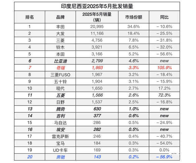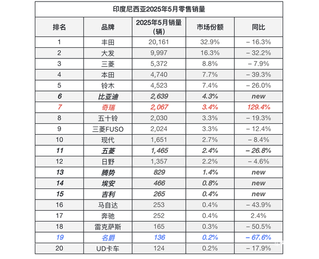 中国汽车品牌在这个东南亚最大的汽车市场崭露头角。前20榜单中可以看到6个中国品牌的身影。而前十榜单中,有比亚迪和奇瑞。比亚迪排名比4月份下跌1级,依然以2799辆的销量排名第6。表现抢眼。奇瑞同比增长105.9%,销量翻倍。以1,993辆销量跃升至第七位,表现同样出色。