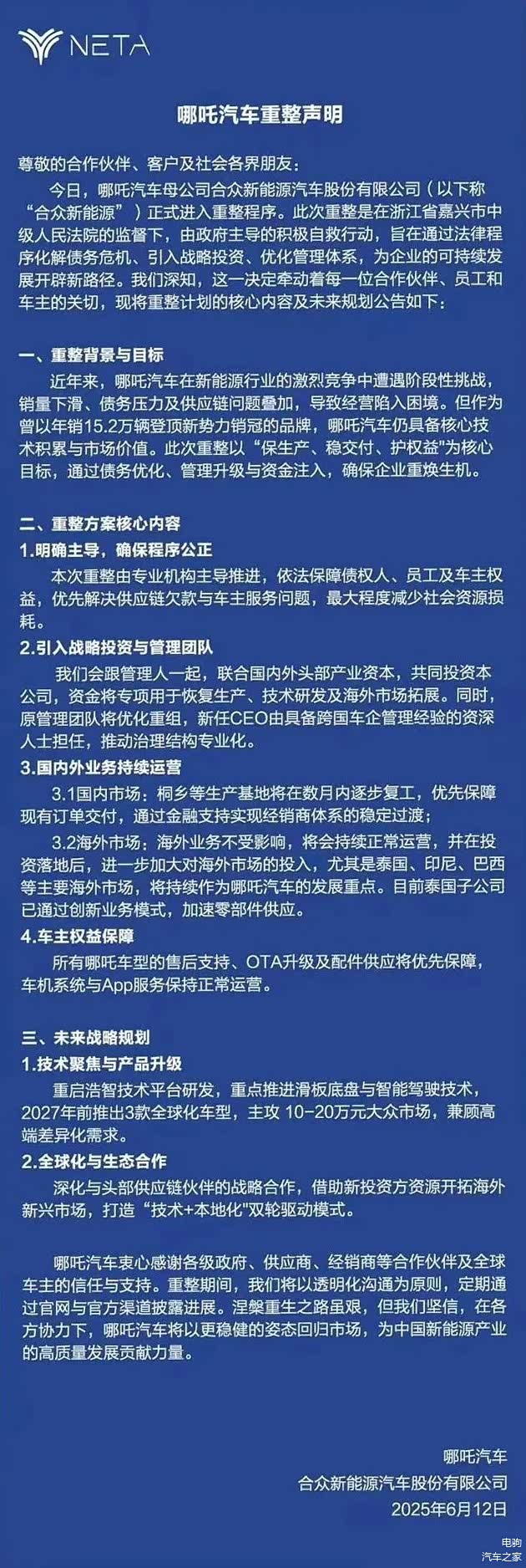 哪吒汽车的最终方案:破产?值得一提的是,就在前不久(6月12日),网传有哪吒汽车员工晒出了一份“哪吒汽车重整声明”。