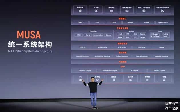 MUSA颇有点直接对标CUDA的意味,它包括统一的编程模型、软件运行库、驱动程序框架、指令集架构、芯片架构,可以说从硬件底层到软件开发,提供了一套完整的解决方案。