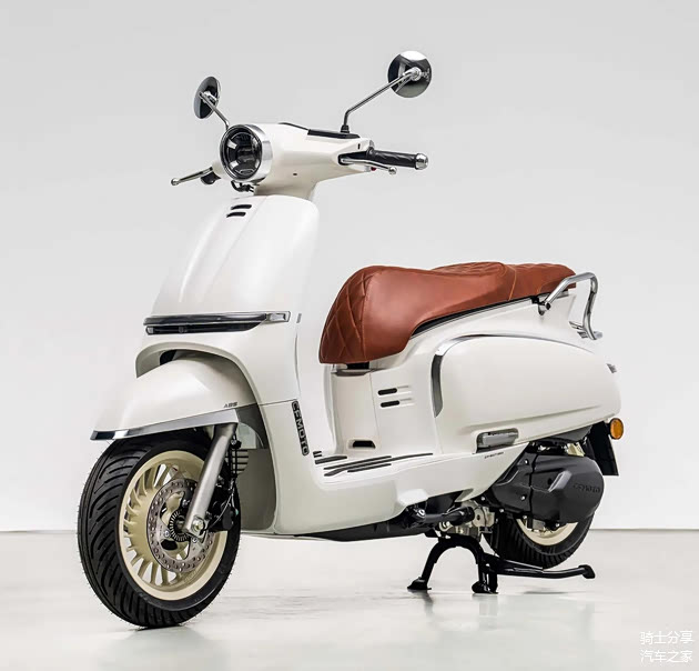 这款车就是网传已久的豪爵125复古踏板车,它外观圆润饱满、风格简洁大气、就算是迎面45度角的平面图片,也会让人看着非常舒适,因此这款车的颜值会不错。