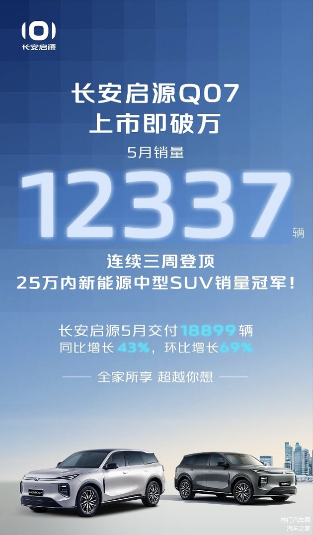 长安启源Q07以远超同级的产品价值,为更多主流家庭用户开启美好出行新体验,自正式发布以来,迅速成为市场黑马:五月份销量12337台,连续四周登顶25万内新能源中型SUV销冠。