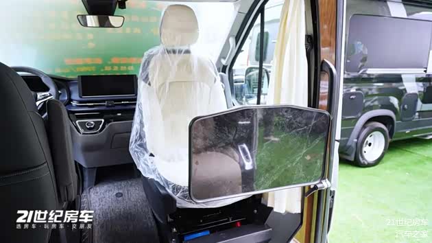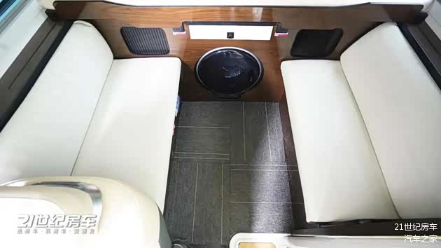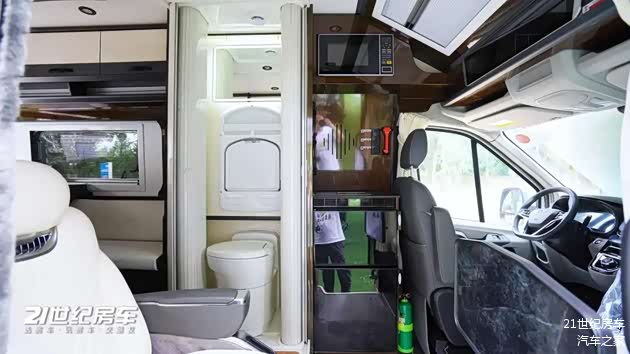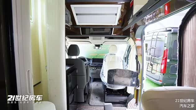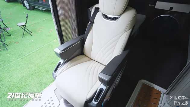 进入房车内部功能分区一目了然,主打实用。上门处有一个航空座椅,具备通风、加热、按摩、腿托等功能,是本车主要的休息区。对边还有一个翻折板,可以用餐和办公,搭配180度旋转的副驾座椅可以形成一个会客区。