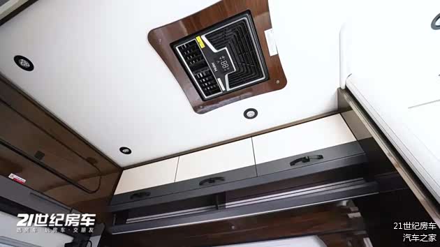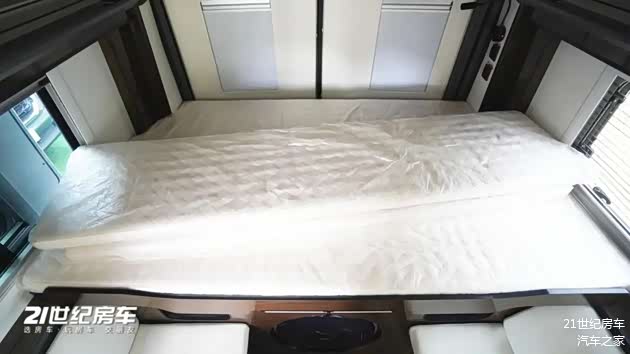 车尾是卧室区域,通过延长板能增加横床的面积,配备舒适的床垫和柔软的床品,为车友营造优质的睡眠环境。上方一圈的储物吊柜,床头设置阅读灯、充电接口等,方便车友睡前阅读和为电子设备充电。该区域还配有顶置空调,在极端天气也能带来舒适的睡卧环境。