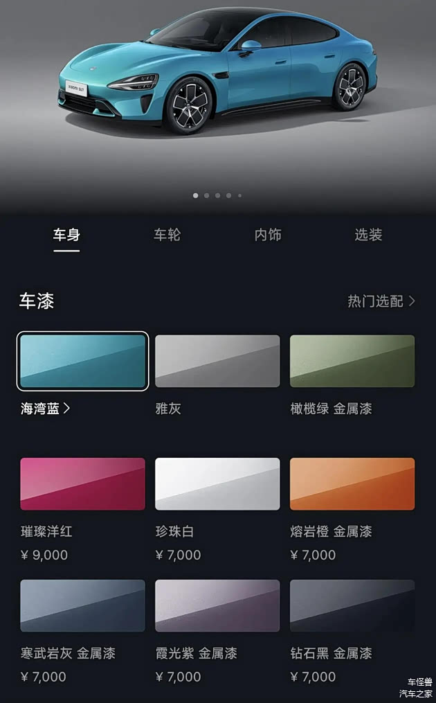 令人注目的是,除了已经公开的钛金属色、宝石绿等5种车色,小米YU7的白色实车涂装、黑色悬浮外后视镜、车侧饰件等细节也在网络上曝光了。参照小米SU7的配色方案,其9种车身颜色中,海湾蓝、雅灰、橄榄绿金属漆是免费的选择,璀璨洋红的选装价格是9000元,其他颜色的选装价格是7000元。根据现有的资料显示,小米YU7在其外观和颜色的选择上,继续采纳了SU7的多样化和差异化的价格策略,为消费者带来了丰富而又个性化的选择。