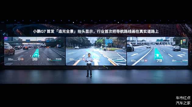 智能座舱方面,小鹏G7也将首搭与华为联合研发的AR-HUD“追光全景”抬头显示系统。在预售时的现场演示可以看到,挡风玻璃上,导航路线被直接“画”在真实道路前方,变道时AR光毯清晰指引方向,岔路口则在错误方向上标出醒目的“X”标记,显示效果相当科幻。